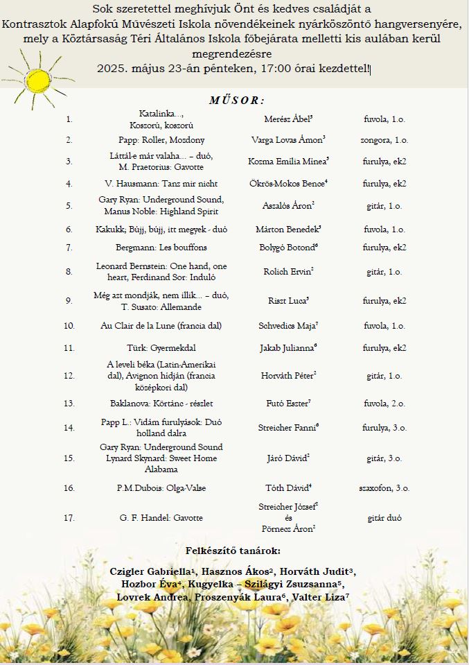 Sok szeretettel meghívjuk Önt és kedves családját a Kontrasztok Alapfokú Művészeti Iskola növendékeinek nyárköszöntő hangversenyére, mely a Köztársaság Téri Általános Iskola főbejárata melletti kis aulában kerül megrendezésre 2025. május 23-án pénteken, 17:00 órai kezdettel!